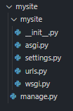 - mysite/__init__.py: Python으로 하여금 이 디렉토리를 패키지처럼 다루라고 알려주는 용도의 단순한 빈 파일입니다. Python 초심자라면, Python 공식 홈페이지의 패키지를 읽어보세요.