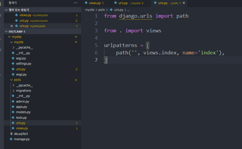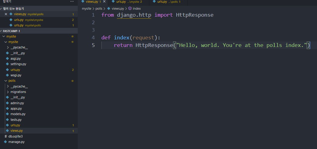 명령어를 실행하면 아래 사진과 같이 새로운 polls라는 폴더가 생성되면서 기본 코드들이 들어갑니다. 자동으로
