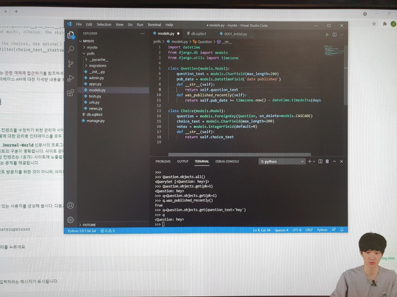 데이터베이스의 개념이 필요하며, 클래스 내부의 변수선언이 스키마 설정이면서 Foreignkey 설정 등을 합니다.