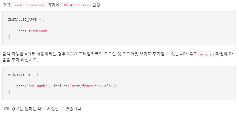 그리고 settings.py의 INSTALLED_APPS에서 rest_framework를 사용할 수 있도록 합니다.